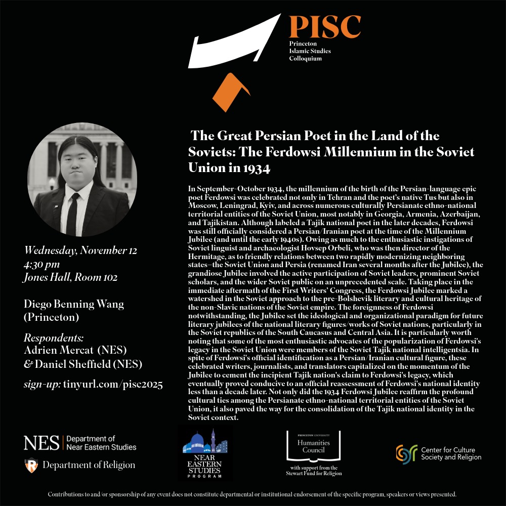 Join us for the PISC event of the Fall 2025 semester, in which we will discuss Diego Benning Wang’s paper, “The Great Persian Poet in the Land of the Soviets: The Ferdowsi Millennium in the Soviet Union in 1934.” Sign-up here to get the pre-circulated paper.